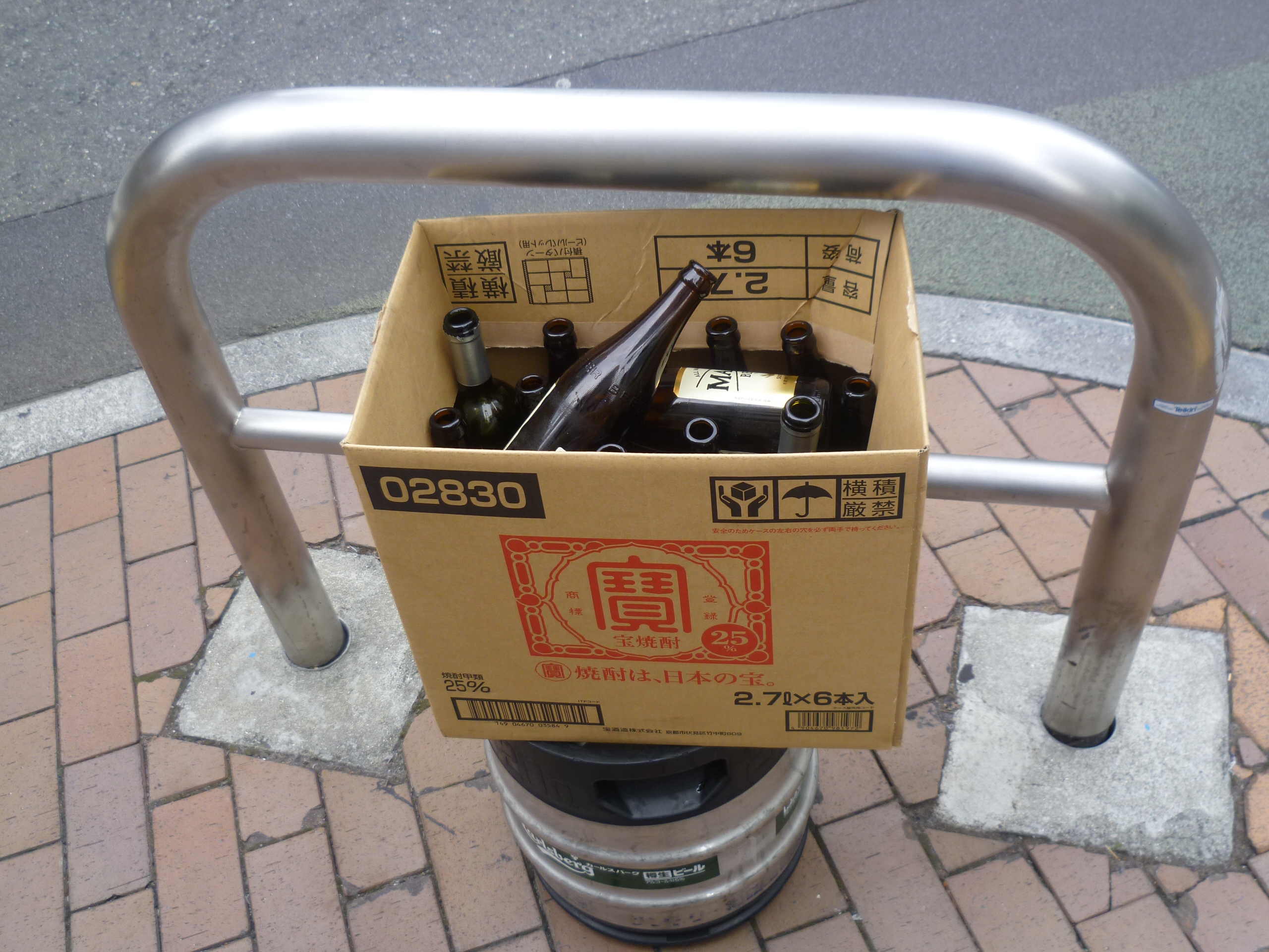 Стеклянные бутылки и пивной кег возле кафе, приготовленные для вывоза.