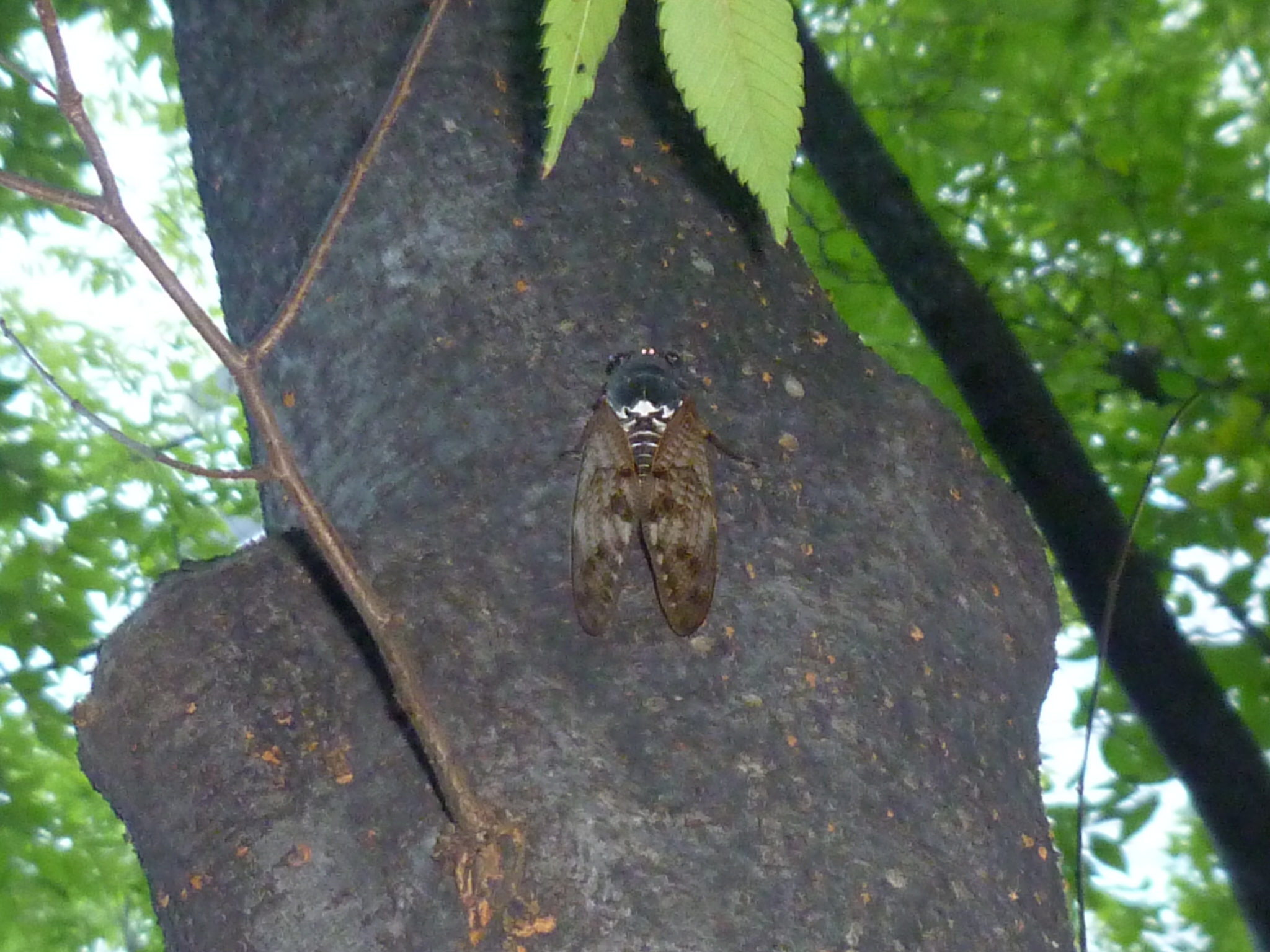 Цикада сидит и стрекочет на дереве возле небоскреба NEC