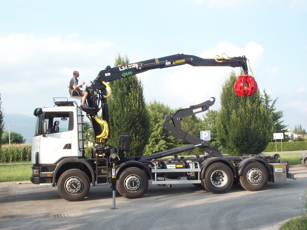 Ломовоз оборудован системой крюкового захвата и гидроманипулятором с грейфером