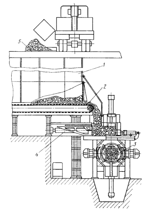 Погрузочная станция бытовых отходов: 1 - бункер-накопитель, 2 - питатель, 3 - камера погрузки, 4 - пресс для бытовых отходов, 5 - опрокидывающаяся платформа.